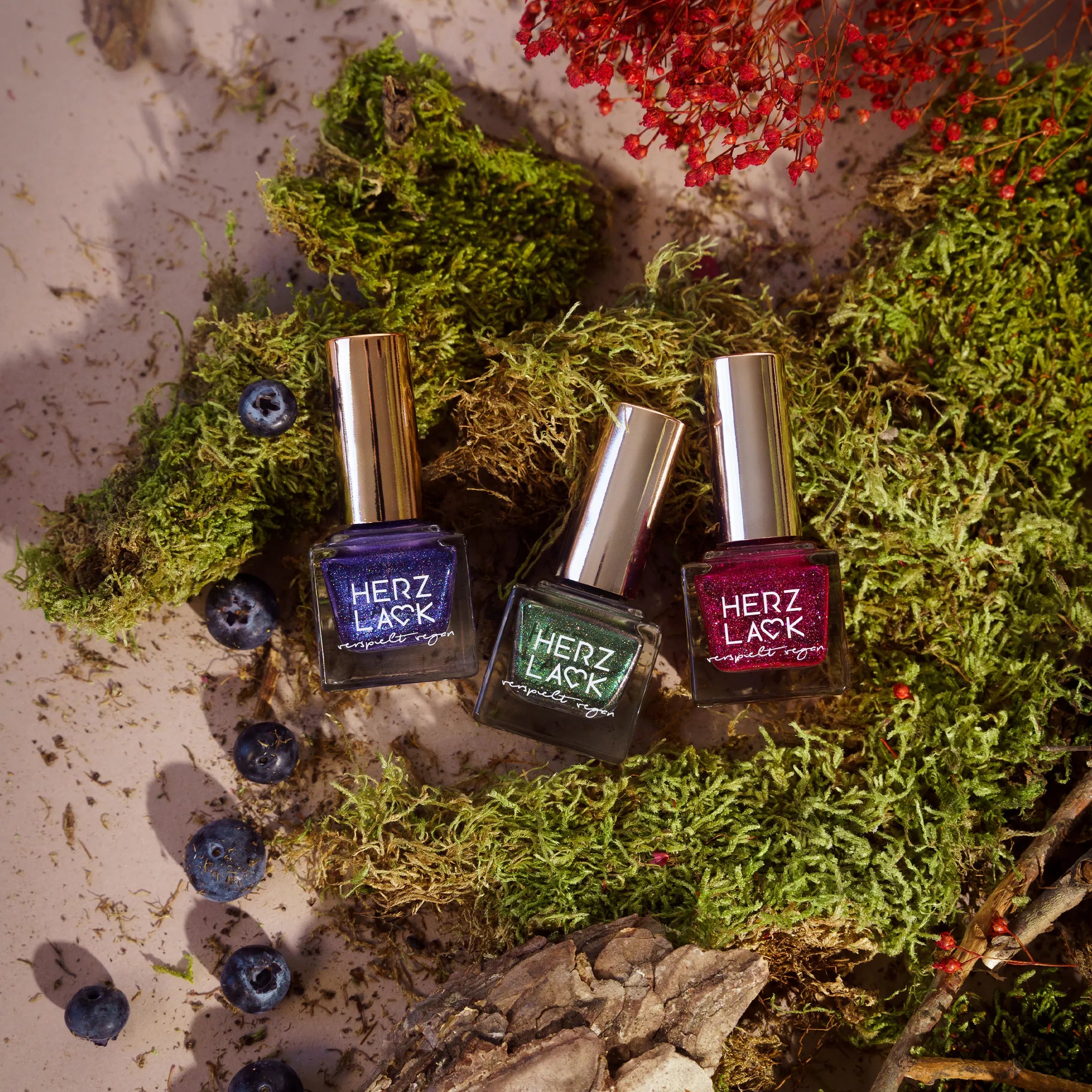 Mit diesen Farben hält der Herbst Einzug auf deinen Nägeln. Lebendige Beerentöne, schimmerndes Moosgrün und funkelndes Blaubeerblau fangen die Farben der Natur ein und bringen die herbstliche Magie direkt auf deine Fingerspitzen.